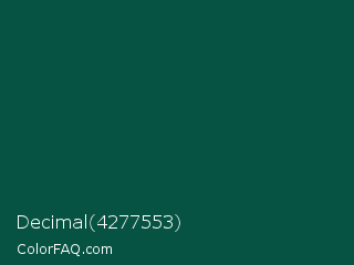 Decimal 4277553 Color is a very dark cyan color and the nearest color is Evening Sea #024e46. Hex code #065343 and RGB value is rgb(6,83,67). In RGB color space, this color is composed of 2% red, 33% green, 26% blue, In CMYK color space, this color is composed of 93% cyan, 0% magenta, 19% yellow , 67% black , In HSL color space, this color has a hue angle of 168° , 87% saturation and 17% lightness.
