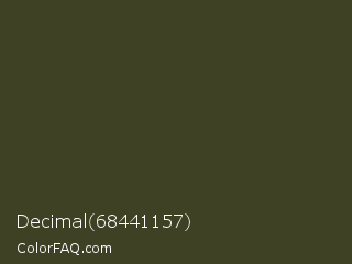 Decimal 68441157 Color is a very dark yellow color and the nearest color is Lisbon Brown #423921. Hex code #3f4125 and RGB value is rgb(63,65,37). In RGB color space, this color is composed of 25% red, 25% green, 15% blue, In CMYK color space, this color is composed of 3% cyan, 0% magenta, 43% yellow , 75% black , In HSL color space, this color has a hue angle of 64° , 27% saturation and 20% lightness.
