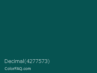 Decimal 4277573 Color is a very dark cyan color and the nearest color is Deep Sea Green #095859. Hex code #065351 and RGB value is rgb(6,83,81). In RGB color space, this color is composed of 2% red, 33% green, 32% blue, In CMYK color space, this color is composed of 93% cyan, 0% magenta, 2% yellow , 67% black , In HSL color space, this color has a hue angle of 178° , 87% saturation and 17% lightness.