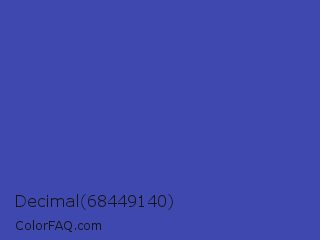 Decimal 68449140 Color is a normal blue color and the nearest color is Violet Blue #324ab2. Hex code #3f48ae and RGB value is rgb(63,72,174). In RGB color space, this color is composed of 25% red, 28% green, 68% blue, In CMYK color space, this color is composed of 64% cyan, 59% magenta, 0% yellow , 32% black , In HSL color space, this color has a hue angle of 235° , 47% saturation and 46% lightness.