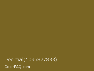 Decimal 1095827833 Color is a normal yellow color and the nearest color is Kumera #886221. Hex code #796523 and RGB value is rgb(121,101,35). In RGB color space, this color is composed of 47% red, 40% green, 14% blue, In CMYK color space, this color is composed of 0% cyan, 17% magenta, 71% yellow , 53% black , In HSL color space, this color has a hue angle of 46° , 55% saturation and 31% lightness.