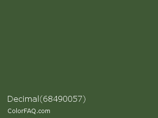 Decimal 68490057 Color is a dark green color and the nearest color is Tom Thumb #3f583b. Hex code #3f5835 and RGB value is rgb(63,88,53). In RGB color space, this color is composed of 25% red, 35% green, 21% blue, In CMYK color space, this color is composed of 28% cyan, 0% magenta, 40% yellow , 65% black , In HSL color space, this color has a hue angle of 103° , 25% saturation and 28% lightness.