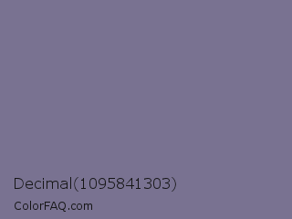 Decimal 1095841303 Color is a normal indigo color and the nearest color is Rhythm #777696. Hex code #797291 and RGB value is rgb(121,114,145). In RGB color space, this color is composed of 47% red, 45% green, 57% blue, In CMYK color space, this color is composed of 17% cyan, 21% magenta, 0% yellow , 43% black , In HSL color space, this color has a hue angle of 254° , 12% saturation and 51% lightness.