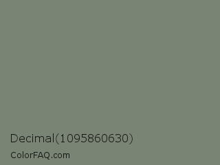 Decimal 1095860630 Color is a normal green color and the nearest color is Smoke #738276. Hex code #798474 and RGB value is rgb(121,132,116). In RGB color space, this color is composed of 47% red, 52% green, 45% blue, In CMYK color space, this color is composed of 8% cyan, 0% magenta, 12% yellow , 48% black , In HSL color space, this color has a hue angle of 101° , 6% saturation and 49% lightness.