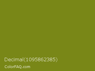 Decimal 1095862385 Color is a normal yellow color and the nearest color is Trendy Green #7c881a. Hex code #798717 and RGB value is rgb(121,135,23). In RGB color space, this color is composed of 47% red, 53% green, 9% blue, In CMYK color space, this color is composed of 10% cyan, 0% magenta, 83% yellow , 47% black , In HSL color space, this color has a hue angle of 68° , 71% saturation and 31% lightness.