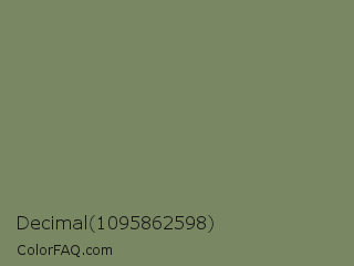 Decimal 1095862598 Color is a normal green color and the nearest color is Flax Smoke #7b8265. Hex code #798762 and RGB value is rgb(121,135,98). In RGB color space, this color is composed of 47% red, 53% green, 38% blue, In CMYK color space, this color is composed of 10% cyan, 0% magenta, 27% yellow , 47% black , In HSL color space, this color has a hue angle of 83° , 16% saturation and 46% lightness.