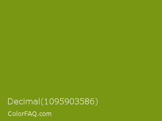Decimal 1095903586 Color is a normal lime color and the nearest color is Trendy Green #7c881a. Hex code #799712 and RGB value is rgb(121,151,18). In RGB color space, this color is composed of 47% red, 59% green, 7% blue, In CMYK color space, this color is composed of 20% cyan, 0% magenta, 88% yellow , 41% black , In HSL color space, this color has a hue angle of 74° , 79% saturation and 33% lightness.