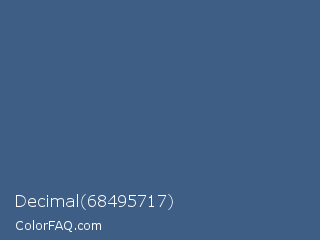 Decimal 68495717 Color is a normal blue color and the nearest color is Blue Bayoux #496679. Hex code #3f5e85 and RGB value is rgb(63,94,133). In RGB color space, this color is composed of 25% red, 37% green, 52% blue, In CMYK color space, this color is composed of 53% cyan, 29% magenta, 0% yellow , 48% black , In HSL color space, this color has a hue angle of 213° , 36% saturation and 38% lightness.