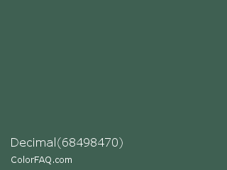Decimal 68498470 Color is a normal green color and the nearest color is Mineral Green #3f5d53. Hex code #3f6052 and RGB value is rgb(63,96,82). In RGB color space, this color is composed of 25% red, 38% green, 32% blue, In CMYK color space, this color is composed of 34% cyan, 0% magenta, 15% yellow , 62% black , In HSL color space, this color has a hue angle of 155° , 21% saturation and 31% lightness.