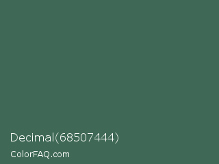 Decimal 68507444 Color is a normal green color and the nearest color is Mineral Green #3f5d53. Hex code #3f6956 and RGB value is rgb(63,105,86). In RGB color space, this color is composed of 25% red, 41% green, 34% blue, In CMYK color space, this color is composed of 40% cyan, 0% magenta, 18% yellow , 59% black , In HSL color space, this color has a hue angle of 153° , 25% saturation and 33% lightness.