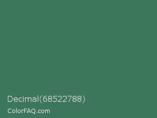 Decimal 68522788 Color is a normal green color and the nearest color is Amazon #3b7a57. Hex code #3f775c and RGB value is rgb(63,119,92). In RGB color space, this color is composed of 25% red, 47% green, 36% blue, In CMYK color space, this color is composed of 47% cyan, 0% magenta, 23% yellow , 53% black , In HSL color space, this color has a hue angle of 151° , 31% saturation and 36% lightness.