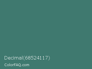 Decimal 68524117 Color is a normal cyan color and the nearest color is Faded Jade #427977. Hex code #3f796f and RGB value is rgb(63,121,111). In RGB color space, this color is composed of 25% red, 47% green, 44% blue, In CMYK color space, this color is composed of 48% cyan, 0% magenta, 8% yellow , 53% black , In HSL color space, this color has a hue angle of 170° , 32% saturation and 36% lightness.