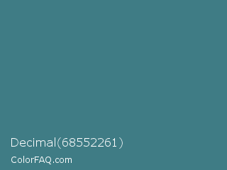 Decimal 68552261 Color is a normal cyan color and the nearest color is Teal Blue #367588. Hex code #3f7c85 and RGB value is rgb(63,124,133). In RGB color space, this color is composed of 25% red, 49% green, 52% blue, In CMYK color space, this color is composed of 53% cyan, 7% magenta, 0% yellow , 48% black , In HSL color space, this color has a hue angle of 188° , 36% saturation and 38% lightness.