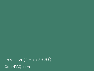 Decimal 68552820 Color is a normal green color and the nearest color is Viridian #40826d. Hex code #3f7d6a and RGB value is rgb(63,125,106). In RGB color space, this color is composed of 25% red, 49% green, 42% blue, In CMYK color space, this color is composed of 50% cyan, 0% magenta, 15% yellow , 51% black , In HSL color space, this color has a hue angle of 162° , 33% saturation and 37% lightness.