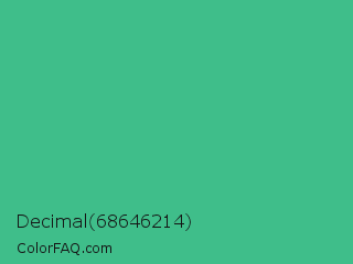 Decimal 68646214 Color is a normal green color and the nearest color is Mint #3eb489. Hex code #3fbe8a and RGB value is rgb(63,190,138). In RGB color space, this color is composed of 25% red, 75% green, 54% blue, In CMYK color space, this color is composed of 67% cyan, 0% magenta, 27% yellow , 25% black , In HSL color space, this color has a hue angle of 155° , 50% saturation and 50% lightness.