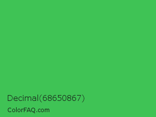 Decimal 68650867 Color is a normal green color and the nearest color is Chateau Green #40a860. Hex code #3fc355 and RGB value is rgb(63,195,85). In RGB color space, this color is composed of 25% red, 76% green, 33% blue, In CMYK color space, this color is composed of 68% cyan, 0% magenta, 56% yellow , 24% black , In HSL color space, this color has a hue angle of 130° , 52% saturation and 51% lightness.