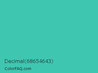 Decimal 68654643 Color is a normal cyan color and the nearest color is Puerto Rico #3fc1aa. Hex code #3fc6b1 and RGB value is rgb(63,198,177). In RGB color space, this color is composed of 25% red, 78% green, 69% blue, In CMYK color space, this color is composed of 68% cyan, 0% magenta, 11% yellow , 22% black , In HSL color space, this color has a hue angle of 171° , 54% saturation and 51% lightness.
