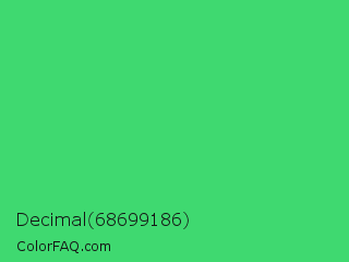 Decimal 68699186 Color is a normal green color and the nearest color is UFO Green #3cd070. Hex code #3fd970 and RGB value is rgb(63,217,112). In RGB color space, this color is composed of 25% red, 85% green, 44% blue, In CMYK color space, this color is composed of 71% cyan, 0% magenta, 48% yellow , 15% black , In HSL color space, this color has a hue angle of 139° , 67% saturation and 55% lightness.