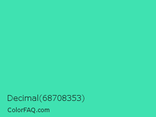 Decimal 68708353 Color is a normal green color and the nearest color is Eucalyptus #44d7a8. Hex code #3fe2b1 and RGB value is rgb(63,226,177). In RGB color space, this color is composed of 25% red, 89% green, 69% blue, In CMYK color space, this color is composed of 72% cyan, 0% magenta, 22% yellow , 11% black , In HSL color space, this color has a hue angle of 162° , 74% saturation and 57% lightness.