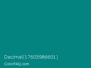 Decimal 17605986601 Color is a dark cyan color and the nearest color is Teal Green #00827f. Hex code #038481 and RGB value is rgb(3,132,129). In RGB color space, this color is composed of 1% red, 52% green, 51% blue, In CMYK color space, this color is composed of 98% cyan, 0% magenta, 2% yellow , 48% black , In HSL color space, this color has a hue angle of 179° , 96% saturation and 26% lightness.