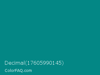 Decimal 17605990145 Color is a dark cyan color and the nearest color is Dark Cyan #008b8b. Hex code #038785 and RGB value is rgb(3,135,133). In RGB color space, this color is composed of 1% red, 53% green, 52% blue, In CMYK color space, this color is composed of 98% cyan, 0% magenta, 1% yellow , 47% black , In HSL color space, this color has a hue angle of 179° , 96% saturation and 27% lightness.