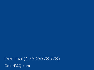 Decimal 17606678578 Color is a dark blue color and the nearest color is Congress Blue #02478e. Hex code #044388 and RGB value is rgb(4,67,136). In RGB color space, this color is composed of 2% red, 26% green, 53% blue, In CMYK color space, this color is composed of 97% cyan, 51% magenta, 0% yellow , 47% black , In HSL color space, this color has a hue angle of 211° , 94% saturation and 27% lightness.