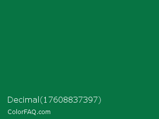 Decimal 17608837397 Color is a dark green color and the nearest color is Dartmouth Green #00703c. Hex code #077443 and RGB value is rgb(7,116,67). In RGB color space, this color is composed of 3% red, 45% green, 26% blue, In CMYK color space, this color is composed of 94% cyan, 0% magenta, 42% yellow , 55% black , In HSL color space, this color has a hue angle of 153° , 89% saturation and 24% lightness.