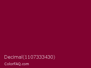 Decimal 1107333430 Color is a dark rose color and the nearest color is Siren #7a013a. Hex code #810230 and RGB value is rgb(129,2,48). In RGB color space, this color is composed of 51% red, 1% green, 19% blue, In CMYK color space, this color is composed of 0% cyan, 98% magenta, 63% yellow , 49% black , In HSL color space, this color has a hue angle of 338° , 97% saturation and 26% lightness.