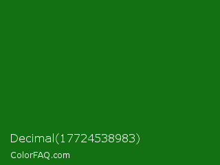 Decimal 17724538983 Color is a dark green color and the nearest color is Japanese Laurel #0a6906. Hex code #147113 and RGB value is rgb(20,113,19). In RGB color space, this color is composed of 8% red, 44% green, 7% blue, In CMYK color space, this color is composed of 82% cyan, 0% magenta, 83% yellow , 56% black , In HSL color space, this color has a hue angle of 119° , 71% saturation and 26% lightness.