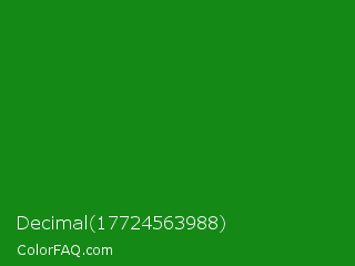 Decimal 17724563988 Color is a normal green color and the nearest color is India Green #138808. Hex code #148916 and RGB value is rgb(20,137,22). In RGB color space, this color is composed of 8% red, 54% green, 9% blue, In CMYK color space, this color is composed of 85% cyan, 0% magenta, 84% yellow , 46% black , In HSL color space, this color has a hue angle of 121° , 75% saturation and 31% lightness.