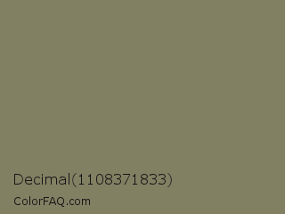 Decimal 1108371833 Color is a normal yellow color and the nearest color is Flax Smoke #7b8265. Hex code #828063 and RGB value is rgb(130,128,99). In RGB color space, this color is composed of 51% red, 50% green, 39% blue, In CMYK color space, this color is composed of 0% cyan, 2% magenta, 24% yellow , 49% black , In HSL color space, this color has a hue angle of 56° , 14% saturation and 45% lightness.