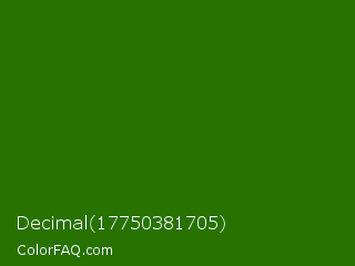 Decimal 17750381705 Color is a dark green color and the nearest color is Napier Green #2a8000. Hex code #277201 and RGB value is rgb(39,114,1). In RGB color space, this color is composed of 15% red, 45% green, 0% blue, In CMYK color space, this color is composed of 66% cyan, 0% magenta, 99% yellow , 55% black , In HSL color space, this color has a hue angle of 100° , 98% saturation and 23% lightness.