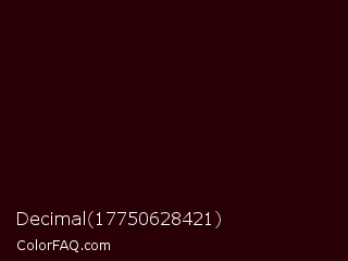 Decimal 17750628421 Color is a almost black red color and the nearest color is Sepia Black #2b0202. Hex code #280005 and RGB value is rgb(40,0,5). In RGB color space, this color is composed of 16% red, 0% green, 2% blue, In CMYK color space, this color is composed of 0% cyan, 100% magenta, 88% yellow , 84% black , In HSL color space, this color has a hue angle of 353° , 100% saturation and 8% lightness.
