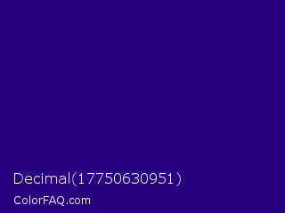 Decimal 17750630951 Color is a dark indigo color and the nearest color is Deep Blue #220878. Hex code #280183 and RGB value is rgb(40,1,131). In RGB color space, this color is composed of 16% red, 0% green, 51% blue, In CMYK color space, this color is composed of 69% cyan, 99% magenta, 0% yellow , 49% black , In HSL color space, this color has a hue angle of 258° , 98% saturation and 26% lightness.