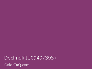 Decimal 1109497395 Color is a normal magenta color and the nearest color is Razzmic Berry Crayola #843179. Hex code #843871 and RGB value is rgb(132,56,113). In RGB color space, this color is composed of 52% red, 22% green, 44% blue, In CMYK color space, this color is composed of 0% cyan, 58% magenta, 14% yellow , 48% black , In HSL color space, this color has a hue angle of 315° , 40% saturation and 37% lightness.