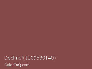 Decimal 1109539140 Color is a normal red color and the nearest color is Tuscan Red #7c4848. Hex code #844948 and RGB value is rgb(132,73,72). In RGB color space, this color is composed of 52% red, 29% green, 28% blue, In CMYK color space, this color is composed of 0% cyan, 45% magenta, 45% yellow , 48% black , In HSL color space, this color has a hue angle of 1° , 29% saturation and 40% lightness.