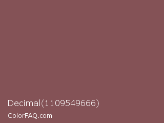 Decimal 1109549666 Color is a normal red color and the nearest color is Deep Taupe #7e5e60. Hex code #845256 and RGB value is rgb(132,82,86). In RGB color space, this color is composed of 52% red, 32% green, 34% blue, In CMYK color space, this color is composed of 0% cyan, 38% magenta, 35% yellow , 48% black , In HSL color space, this color has a hue angle of 355° , 23% saturation and 42% lightness.