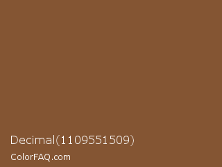Decimal 1109551509 Color is a normal orange color and the nearest color is Potters Clay #8c5738. Hex code #845533 and RGB value is rgb(132,85,51). In RGB color space, this color is composed of 52% red, 33% green, 20% blue, In CMYK color space, this color is composed of 0% cyan, 36% magenta, 61% yellow , 48% black , In HSL color space, this color has a hue angle of 25° , 44% saturation and 36% lightness.