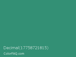 Decimal 17758721815 Color is a normal green color and the nearest color is Illuminating Emerald #319177. Hex code #339075 and RGB value is rgb(51,144,117). In RGB color space, this color is composed of 20% red, 56% green, 46% blue, In CMYK color space, this color is composed of 65% cyan, 0% magenta, 19% yellow , 44% black , In HSL color space, this color has a hue angle of 163° , 48% saturation and 38% lightness.