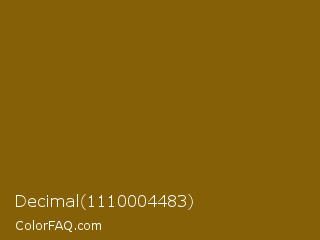 Decimal 1110004483 Color is a dark orange color and the nearest color is Rusty Nail #86560a. Hex code #856007 and RGB value is rgb(133,96,7). In RGB color space, this color is composed of 52% red, 38% green, 3% blue, In CMYK color space, this color is composed of 0% cyan, 28% magenta, 95% yellow , 48% black , In HSL color space, this color has a hue angle of 42° , 90% saturation and 27% lightness.