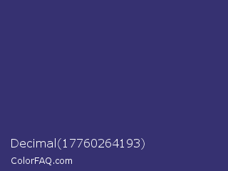 Decimal 17760264193 Color is a normal indigo color and the nearest color is Jacarta #3a2a6a. Hex code #363171 and RGB value is rgb(54,49,113). In RGB color space, this color is composed of 21% red, 19% green, 44% blue, In CMYK color space, this color is composed of 52% cyan, 57% magenta, 0% yellow , 56% black , In HSL color space, this color has a hue angle of 245° , 40% saturation and 32% lightness.