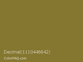 Decimal 1110446642 Color is a normal yellow color and the nearest color is Spanish Bistre #807532. Hex code #857730 and RGB value is rgb(133,119,48). In RGB color space, this color is composed of 52% red, 47% green, 19% blue, In CMYK color space, this color is composed of 0% cyan, 11% magenta, 64% yellow , 48% black , In HSL color space, this color has a hue angle of 50° , 47% saturation and 35% lightness.