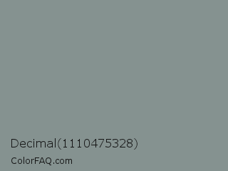 Decimal 1110475328 Color is a normal cyan color and the nearest color is Oslo Gray #878d91. Hex code #859290 and RGB value is rgb(133,146,144). In RGB color space, this color is composed of 52% red, 57% green, 56% blue, In CMYK color space, this color is composed of 9% cyan, 0% magenta, 1% yellow , 43% black , In HSL color space, this color has a hue angle of 171° , 6% saturation and 55% lightness.