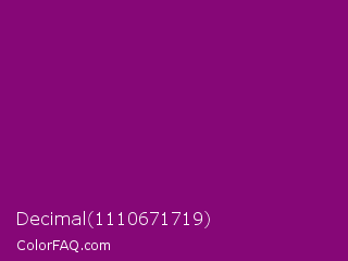 Decimal 1110671719 Color is a dark magenta color and the nearest color is Patriarch #800080. Hex code #860777 and RGB value is rgb(134,7,119). In RGB color space, this color is composed of 53% red, 3% green, 47% blue, In CMYK color space, this color is composed of 0% cyan, 95% magenta, 11% yellow , 47% black , In HSL color space, this color has a hue angle of 307° , 90% saturation and 28% lightness.