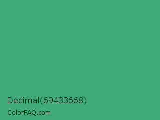 Decimal 69433668 Color is a normal green color and the nearest color is Ocean Green #41aa78. Hex code #40aa78 and RGB value is rgb(64,170,120). In RGB color space, this color is composed of 25% red, 67% green, 47% blue, In CMYK color space, this color is composed of 62% cyan, 0% magenta, 29% yellow , 33% black , In HSL color space, this color has a hue angle of 152° , 45% saturation and 46% lightness.