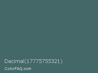 Decimal 17775755321 Color is a normal cyan color and the nearest color is Deep Space Sparkle #4a646c. Hex code #436867 and RGB value is rgb(67,104,103). In RGB color space, this color is composed of 26% red, 41% green, 40% blue, In CMYK color space, this color is composed of 36% cyan, 0% magenta, 1% yellow , 59% black , In HSL color space, this color has a hue angle of 178° , 22% saturation and 34% lightness.