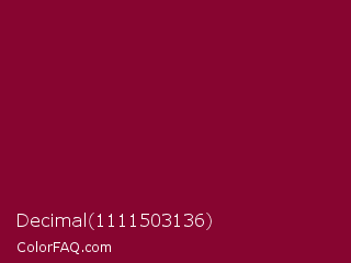 Decimal 1111503136 Color is a dark rose color and the nearest color is Paprika #8d0226. Hex code #870530 and RGB value is rgb(135,5,48). In RGB color space, this color is composed of 53% red, 2% green, 19% blue, In CMYK color space, this color is composed of 0% cyan, 96% magenta, 64% yellow , 47% black , In HSL color space, this color has a hue angle of 340° , 93% saturation and 27% lightness.