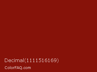 Decimal 1111516169 Color is a dark red color and the nearest color is Barn Red #7c0a02. Hex code #871209 and RGB value is rgb(135,18,9). In RGB color space, this color is composed of 53% red, 7% green, 4% blue, In CMYK color space, this color is composed of 0% cyan, 87% magenta, 93% yellow , 47% black , In HSL color space, this color has a hue angle of 4° , 88% saturation and 28% lightness.