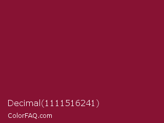 Decimal 1111516241 Color is a dark rose color and the nearest color is Claret #7f1734. Hex code #871233 and RGB value is rgb(135,18,51). In RGB color space, this color is composed of 53% red, 7% green, 20% blue, In CMYK color space, this color is composed of 0% cyan, 87% magenta, 62% yellow , 47% black , In HSL color space, this color has a hue angle of 343° , 76% saturation and 30% lightness.