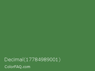 Decimal 17784989001 Color is a normal green color and the nearest color is Fern Green #4f7942. Hex code #478145 and RGB value is rgb(71,129,69). In RGB color space, this color is composed of 28% red, 51% green, 27% blue, In CMYK color space, this color is composed of 45% cyan, 0% magenta, 47% yellow , 49% black , In HSL color space, this color has a hue angle of 118° , 30% saturation and 39% lightness.